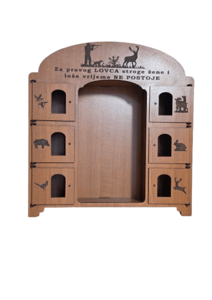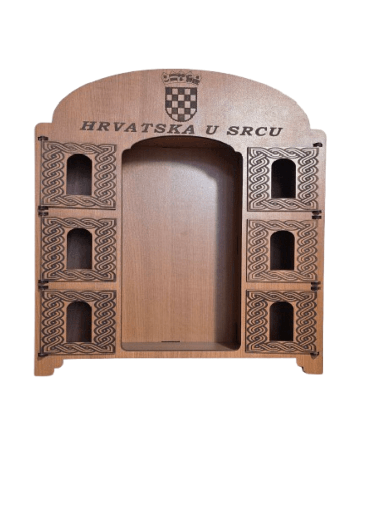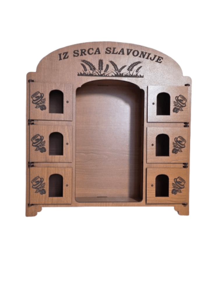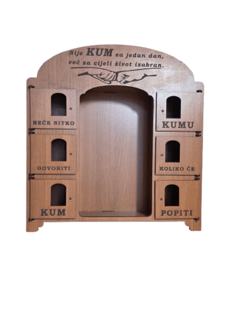 Kredenac za čuturu izrađen je tako da iza svojih 6 vratašca skriva čašice, dok se u sredini nalazi prostor predviđen za bocu. Ukratko: sve je na svom mjestu, uredno složeno i spremno za trenutke kad se kaže “ma samo ćemo jednu”.