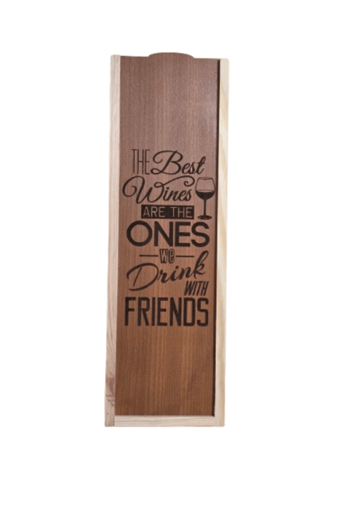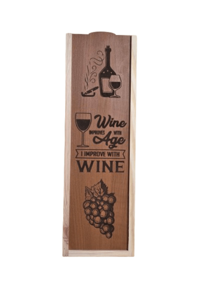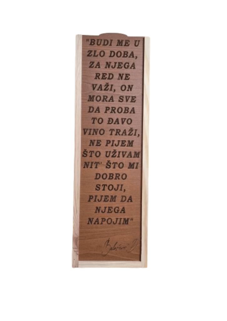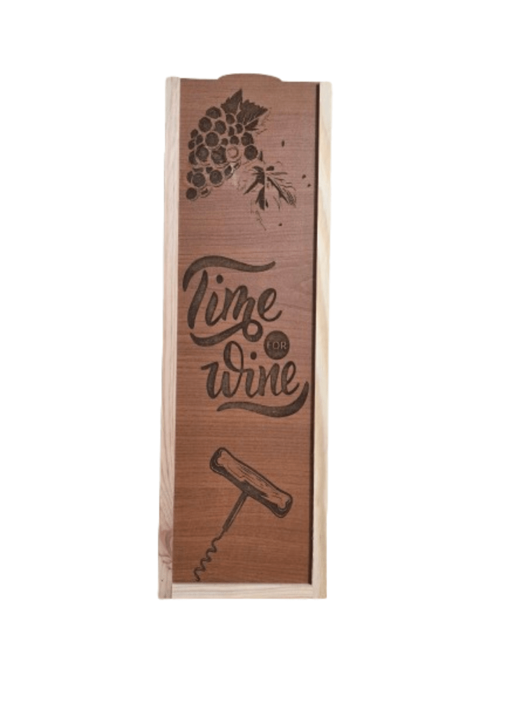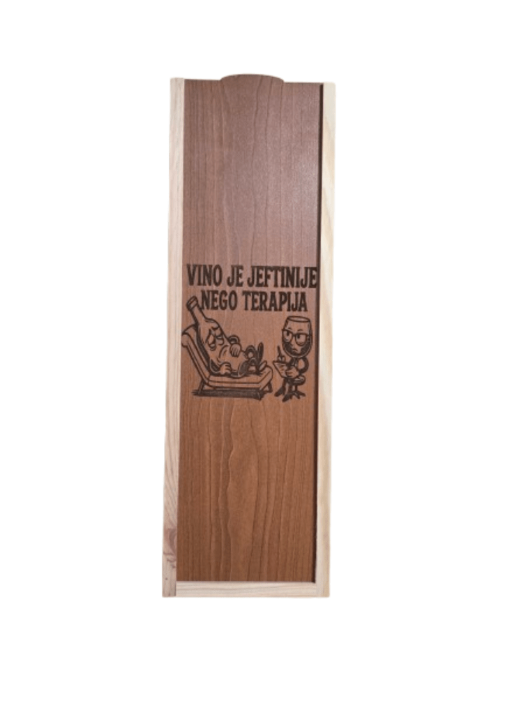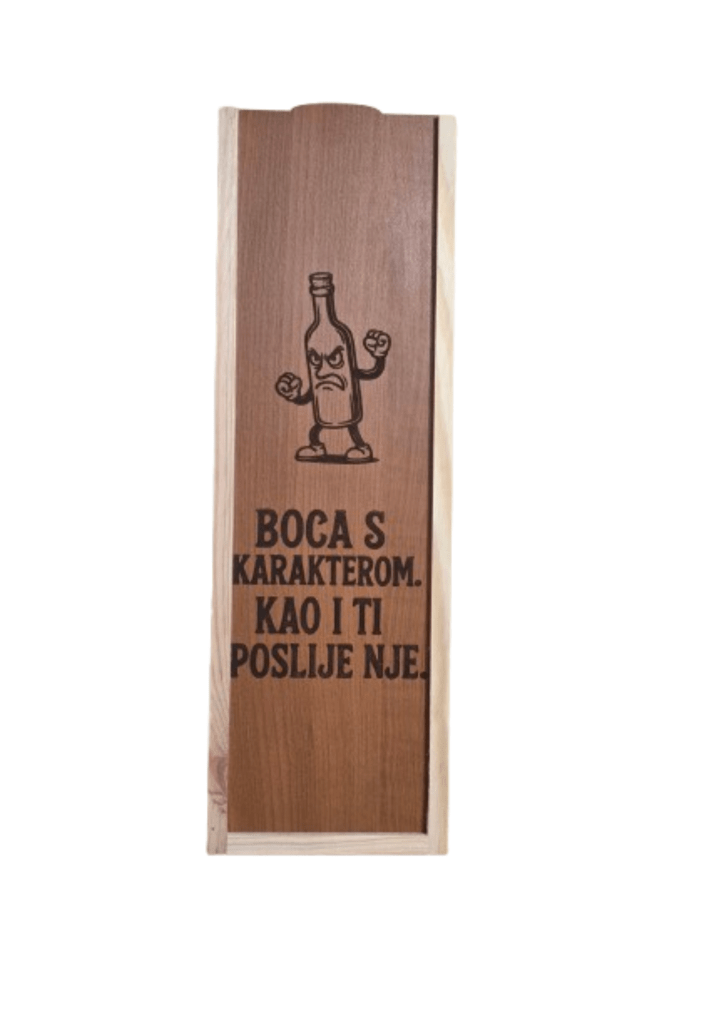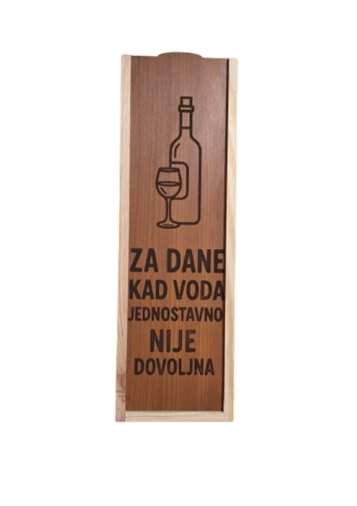 Ova drvena kutija za vino idealna je kad želiš da poklon izgleda ozbiljnije, urednije i jednostavno bolje nego kad bocu doneseš “ovako samu”. Gravura dolazi na poklopac od HDF materijala u boji trešnje, što daje lijep, topao i elegantan izgled, a po narudžbi je moguće izraditi i varijantu na bijelom materijalu.