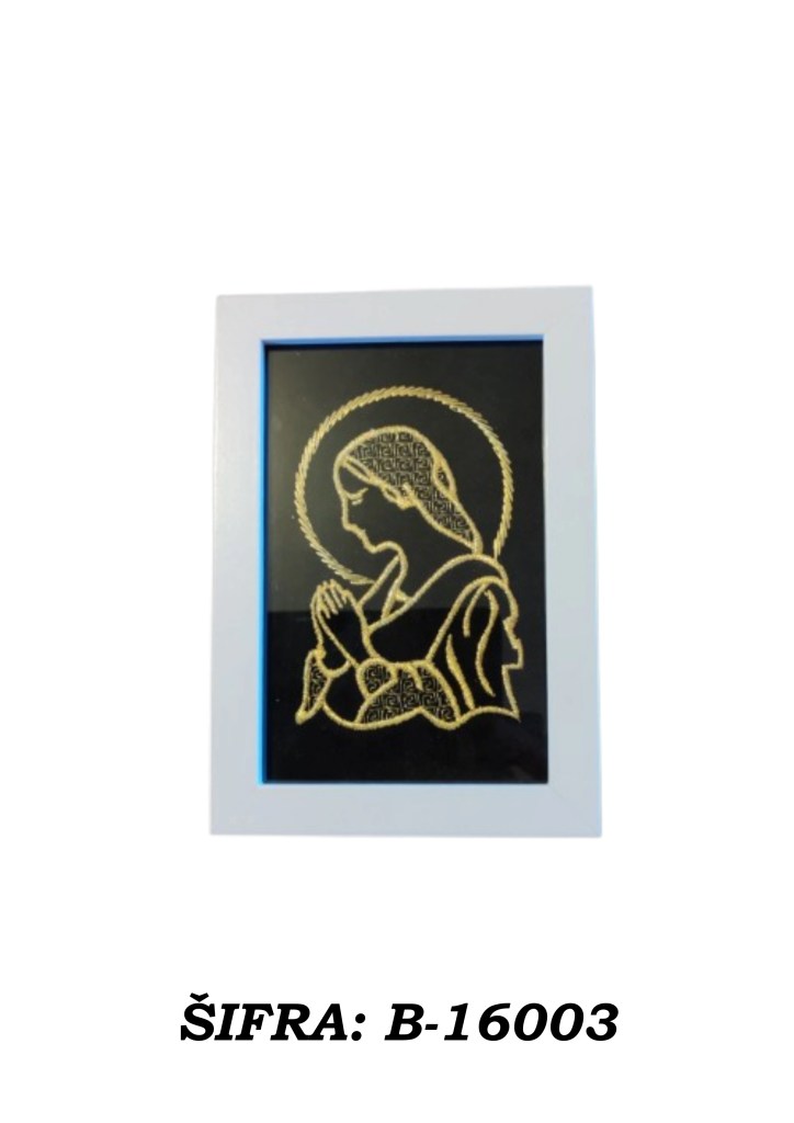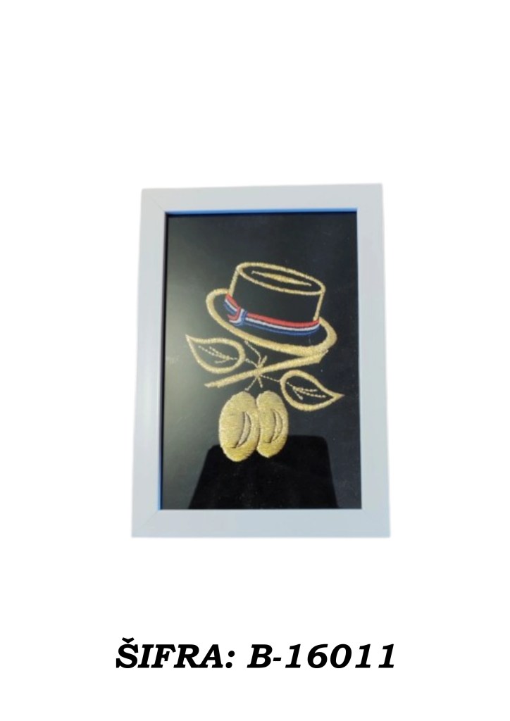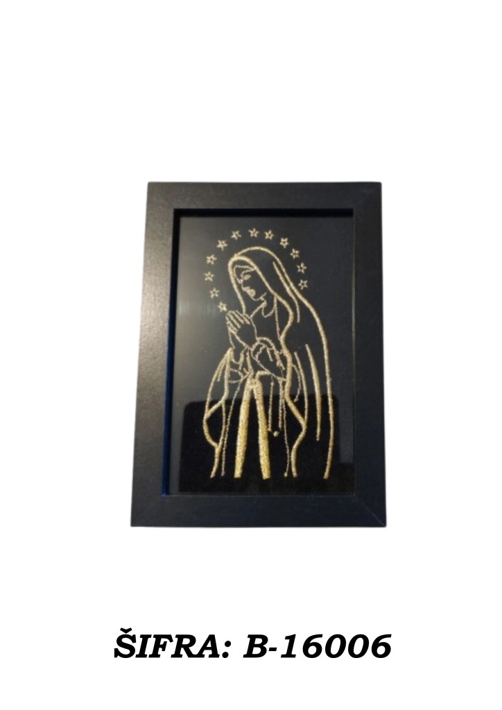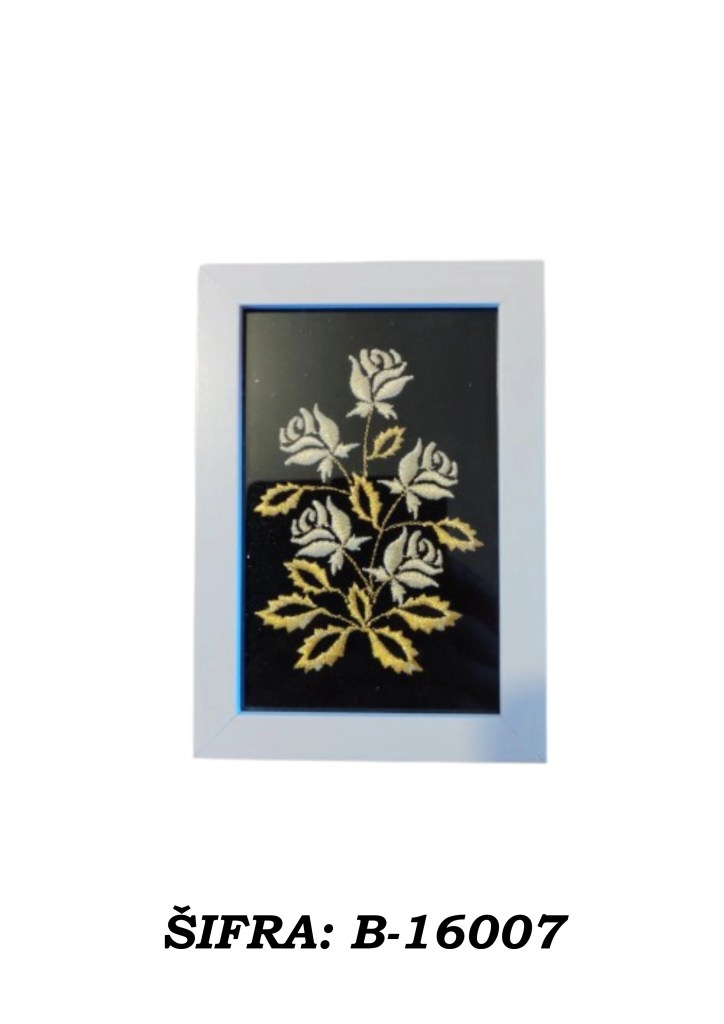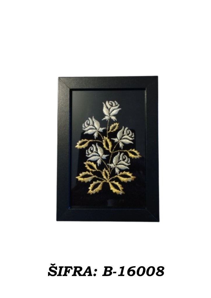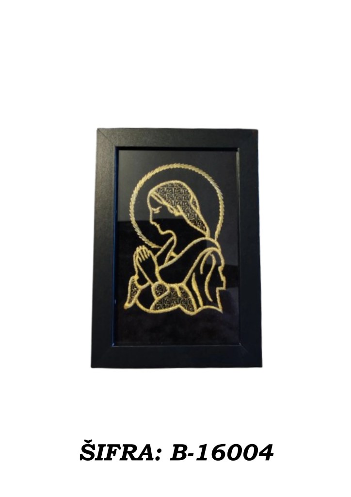 Ove slike rađene su zlatovezom i dolaze u praktičnoj veličini 10 × 15 cm, dovoljno male da stanu gotovo svugdje, a dovoljno upečatljive da ne izgledaju kao da su se slučajno našle u prostoru. Mogu se postaviti samostalno na policu, komodu, stol ili vitrinu, a mogu se i objesiti na zid ako želite da se ponašaju ozbiljno kao prava mala umjetnička djela.